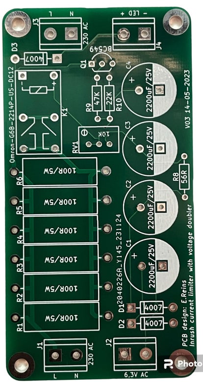 Inschakelstroombegrenzer met ingebouwde spanningsverdubbelaar. Men plaatst deze begrenzer tussen de aan/uit schakelaar en primaire wikkeling van de voedingstrafo. Op het moment dat de versterker ingeschakeld wordt, vertoont de voedingstrafo en de buffercondensator van de voeding even een moment kortsluitgedrag. Er loopt dan een flinke stroom door de zekering, met als gevolg dat de zekering doorbrandt. Deze schakeling zorgt ervoor dat deze grote stroom eerst door een aantal weerstanden geleid wordt, om vervolgens overbrugd te worden door het relais.