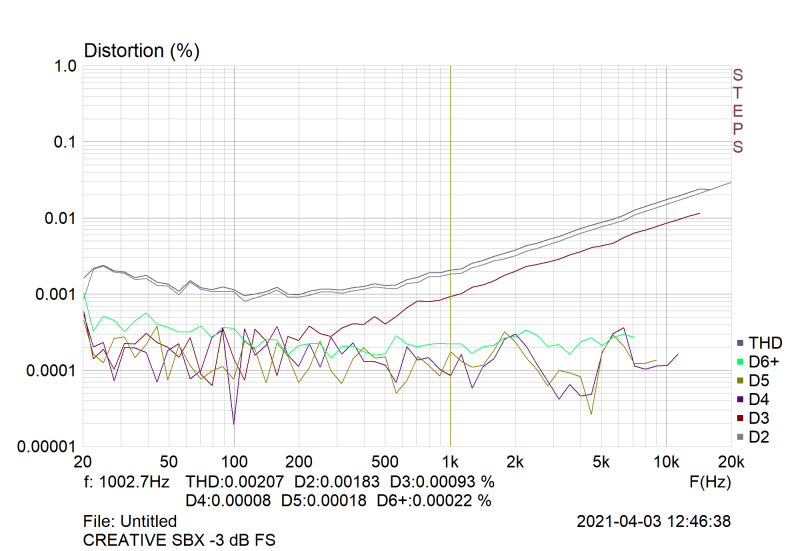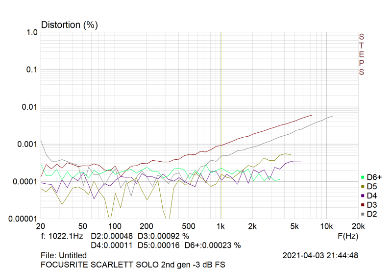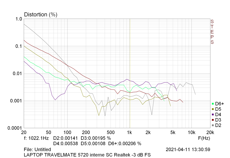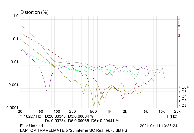 The sound cards, including the one from the Travelmate laptop tested here, are all in my possession. This has allowed me to thoroughly test them at various levels. From these tests, the Focusrite Scarlett Solo emerged as the best option. While most sound cards can handle a maximum input voltage of 1 Vrms, they generally perform better at lower voltages. To investigate this further, I conducted measurements at the following values: