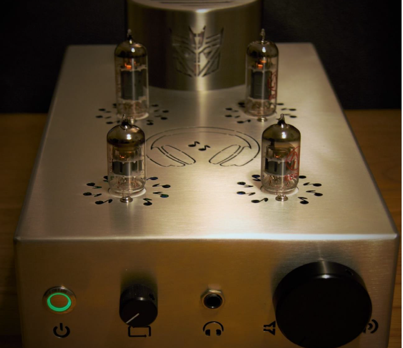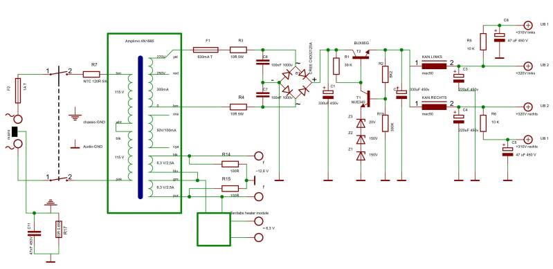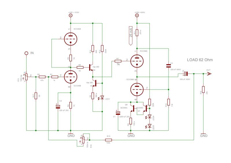 De ingangstrap is een SRPP-schakeling rondom de ECC83 met een emittervolger. De eindtrap is een White kathodevolger met een transistor stroombron aan de kathode en levert 25 mA. De complete schakeling levert een uitgangsimpedantie op van 1,25 Ohm bij 1 kHz. De gloeispanning van de eindbuizen is wisselstroom gevoed, en van de voorbuizen gelijkstroom d.m.v. een Tentlabs heater module. Dit levert een stille versterker op zonder brom. De voeding is gestabiliseerd op 330V, dus de UB+ na de Mec’s 50 wordt dan ongeveer 320 en 310 V. Er zit een extra condensator tussen van 220uF omdat anders de mec’s niet of niet goed werken. Dit onderdrukt de rimpelspanning nog wat meer. Een leuke gadget is een regelbare negatieve feedback van +/-6dB. De versterker levert een maximaal vermogen van 129 mWatt, bij een belasting van 62 Ohm per kanaal (koptelefoon van AKG type701).