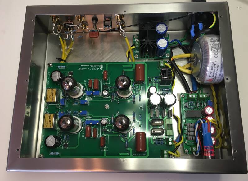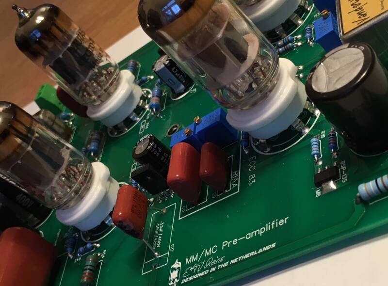 Deze schakelbare MM/MC phono-voorversterker is volledig DC-gekoppeld en is zorgvuldig ontworpen om optimale geluidskwaliteit te waarborgen. De MM-ingangstrap is opgebouwd uit een versterkende trap met een stroombron aan de anode, gevolgd door een kathodevolger waarvan de kathodeweerstand is gekoppeld aan de kathode van de versterkende trap. Deze configuratie creëert een terugkoppelingsmechanisme dat de versterking van de trap aanzienlijk verhoogt, wat resulteert in een verbeterde signaal-ruisverhouding. De versterkingsfactor aan de uitgang van deze trap bedraagt ongeveer 133, met een lage uitgangsimpedantie van circa 700 Ω. De RIAA-correctieschakeling is direct gekoppeld aan de kathode van de kathodevolger en is uitgerust met drie hoogwaardige 20-slag trimpotentiometers van het gerenommeerde merk Bourns, wat een uiterst nauwkeurige afstelling mogelijk maakt. Voor de MC-ingang is een hoogwaardige step-up transformator toegevoegd, de Vanderveen MC-10, speciaal ontwikkeld voor moving coil pick-upelementen. Deze transformator versterkt het lage MC-signaal met een factor 10, waardoor directe aansluiting op de MM-ingang van de voorversterker mogelijk wordt.